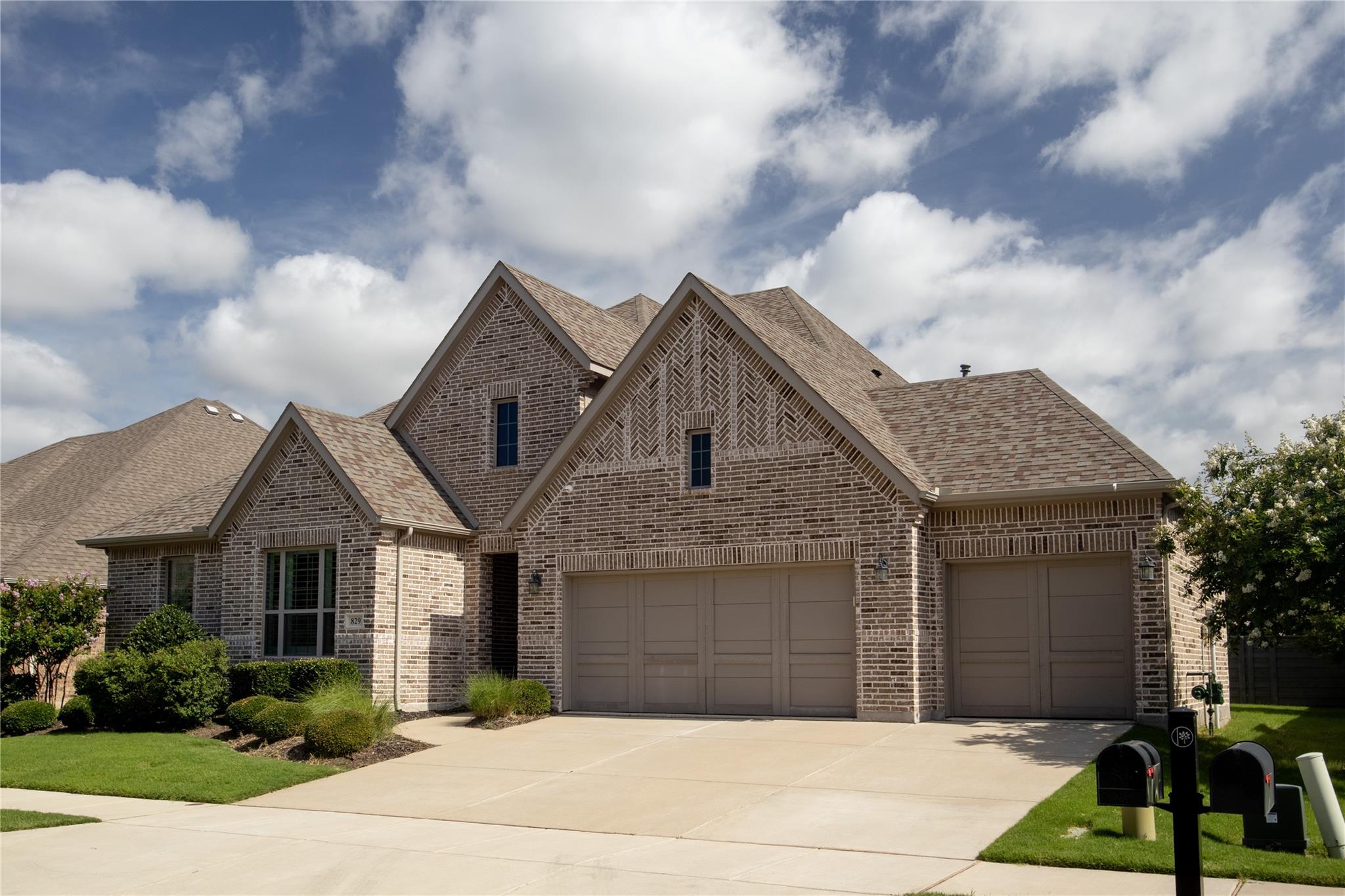 View of front of property with brick siding, a shingled roof, concrete driveway, and a front yard